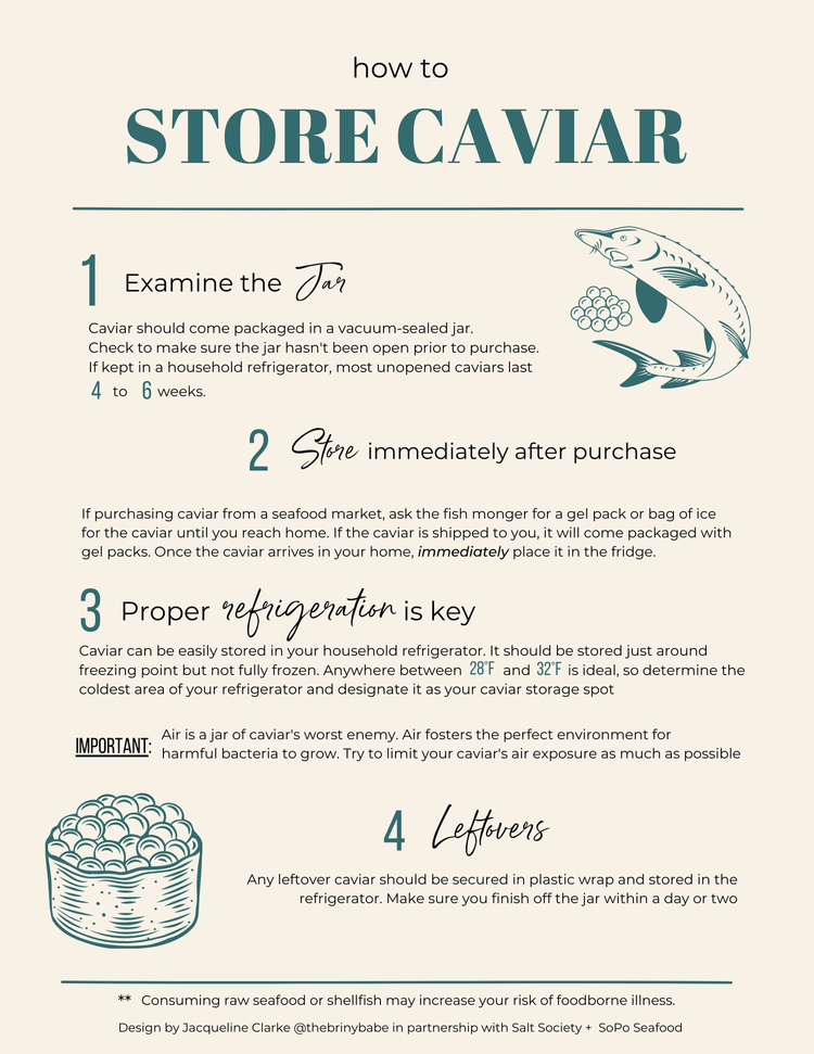 First, what kind of jar is the caviar stored in? All of our caviar here at SoPo Seafood is stored in glass vacuum-sealed containers. If kept in a household refrigerator, most unopened caviars last four to six weeks.