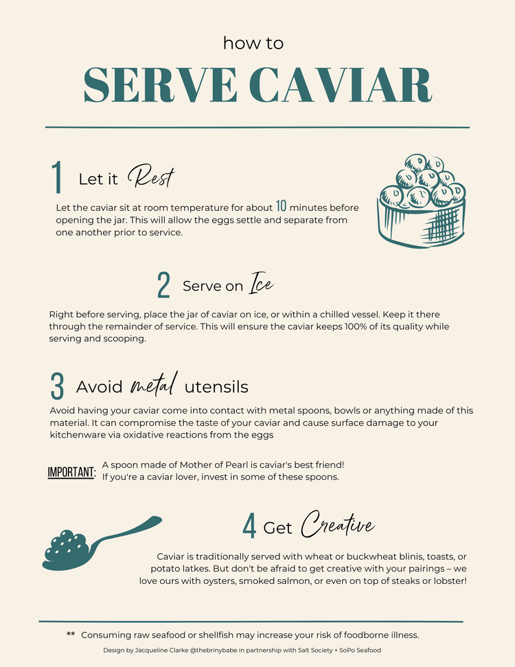 From here, you can put the container on ice and serve or move it to a separate cold vessel. Proper dishware and implements are key here and help ensure the caviar keeps 100% of its quality while serving and scooping.