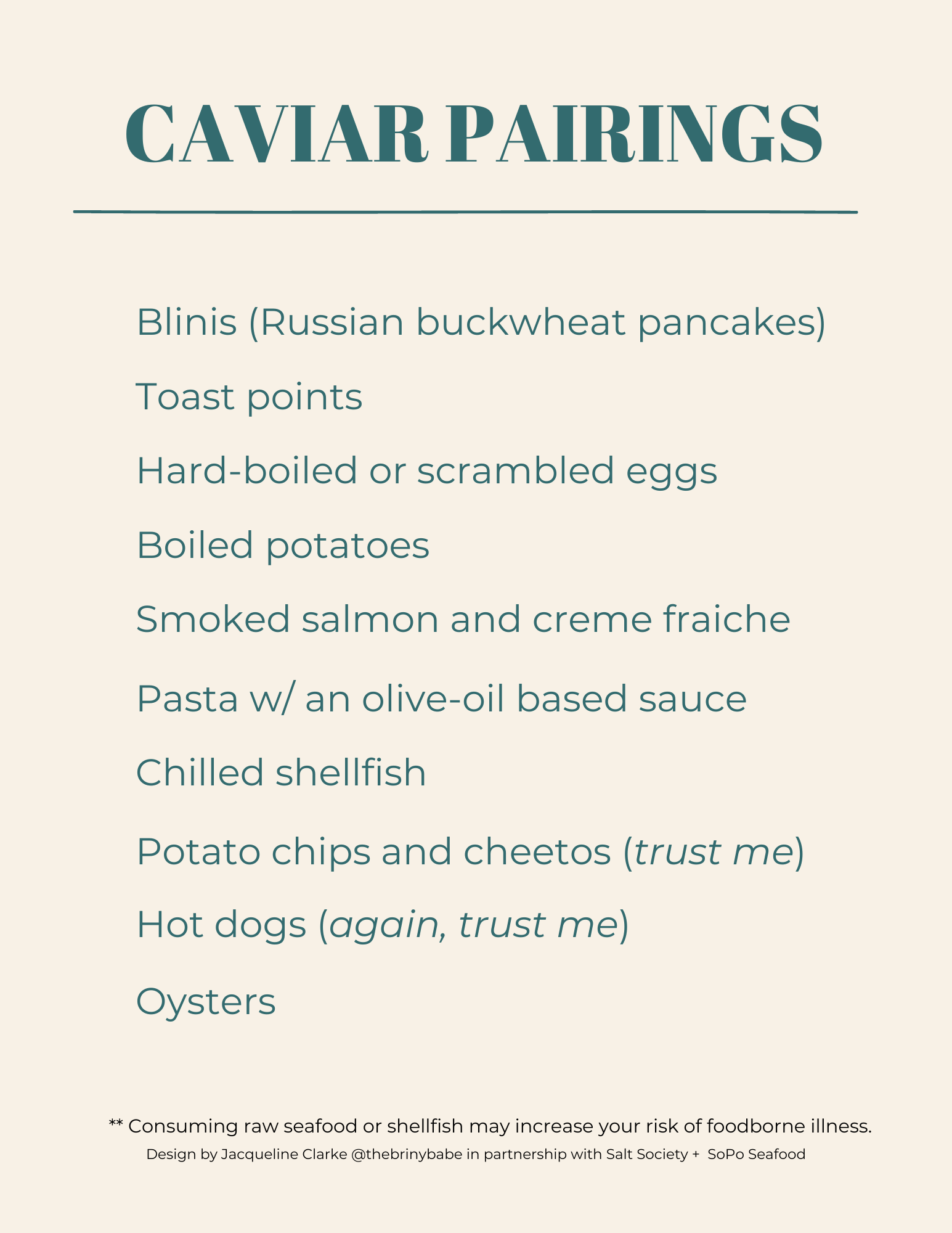 Finally, caviar is traditionally served on its own on a mother of pearl spoon, or on blinis, toasts, or potato latkes with crème fraiche, accompanied by champagne or vodka. But don't be afraid to get creative with your caviar pairings – we love ours with oysters, smoked salmon, or even on top of steaks or lobster.