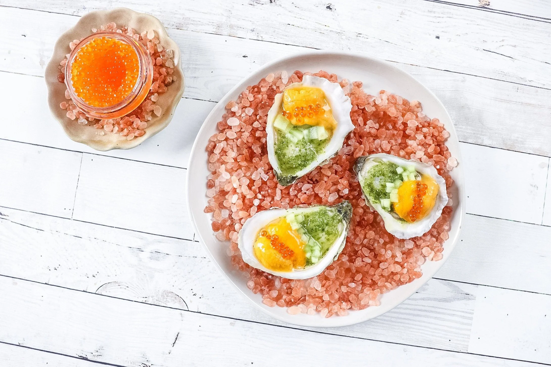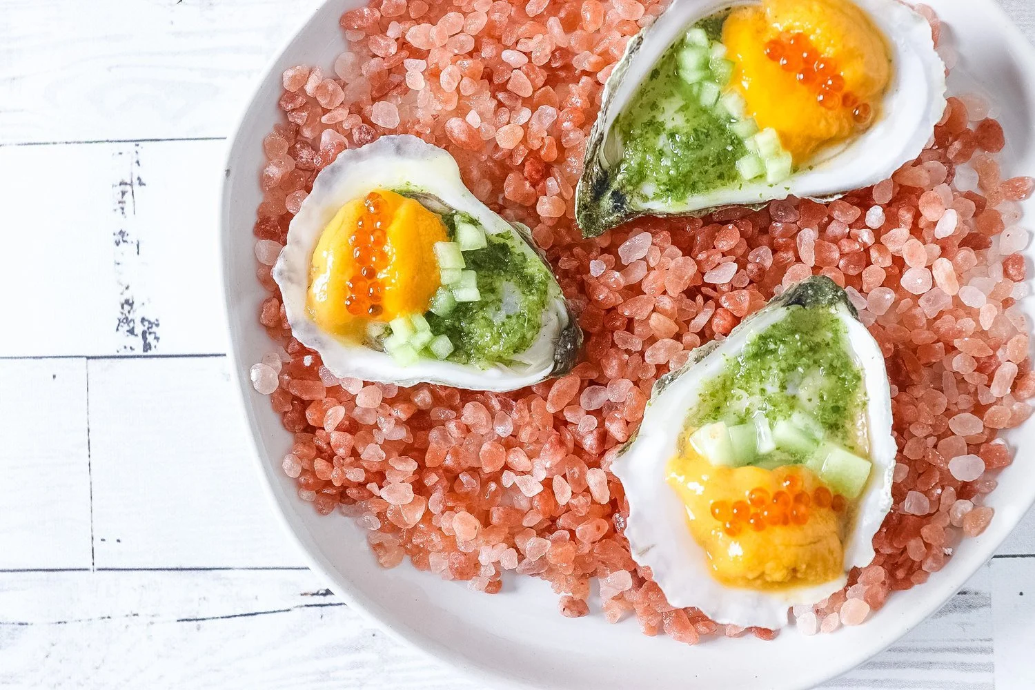 - Assembling: Spoon the aguachile marinade onto the shucked oyster. Add on 1-2 tsp of your reserved English cucumber cubes. Place one (or more!) tongue of uni across your oyster. Garnish with your trout roe.